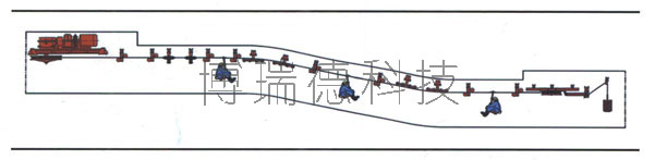 5、架空乘人裝置布置方式靈活、獨(dú)特。除布置在專用巷道外,還可以與皮帶輸送機(jī)共用巷道,也可以與單鉤提升絞車共用巷道。也可布置在小斷面巷道還可以通過(guò)單向往復(fù)運(yùn)行實(shí)現(xiàn)小運(yùn)量的人員輸送。