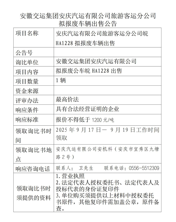 旅游客運(yùn)分公司擬報廢車輛出售公告